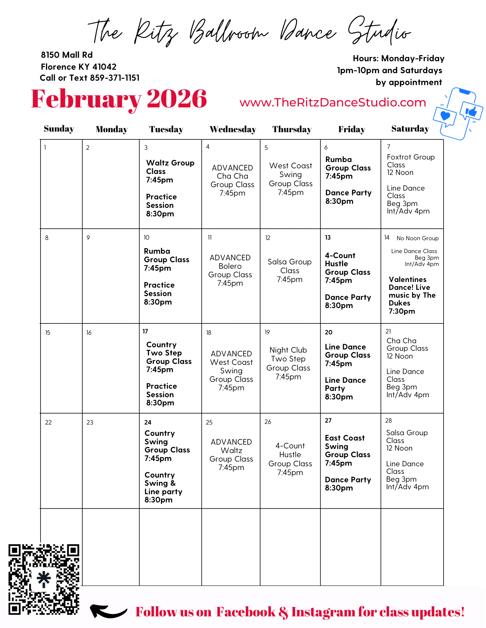 *This is our GROUP CLASS calendar NOT private lessons. Private lessons can be scheduled any time Monday-Friday 1-10pm by appointment and Saturday by appointment.